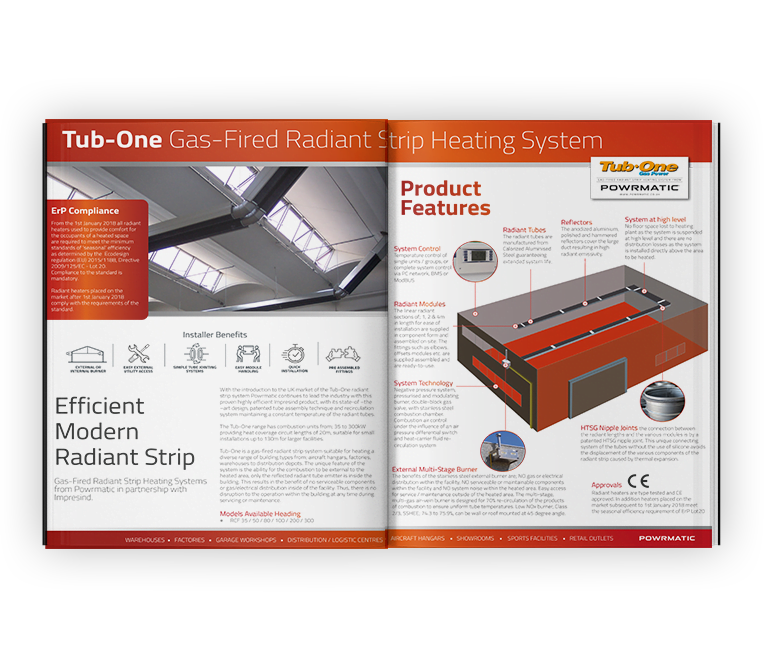 With the introduction to the UK market of the Tub-One radiant strip system Powrmatic continues to lead the industry with this proven highly efficient Impresind product, with its state-of –the –art design, patented tube assembly technique and recirculation system maintaining a constant temperature of the radiant tubes. The Tub-One range has combustion units from; 35 to 300kW providing heat coverage circuit lengths of 20m, suitable for small installations up to 130m for larger facilities.