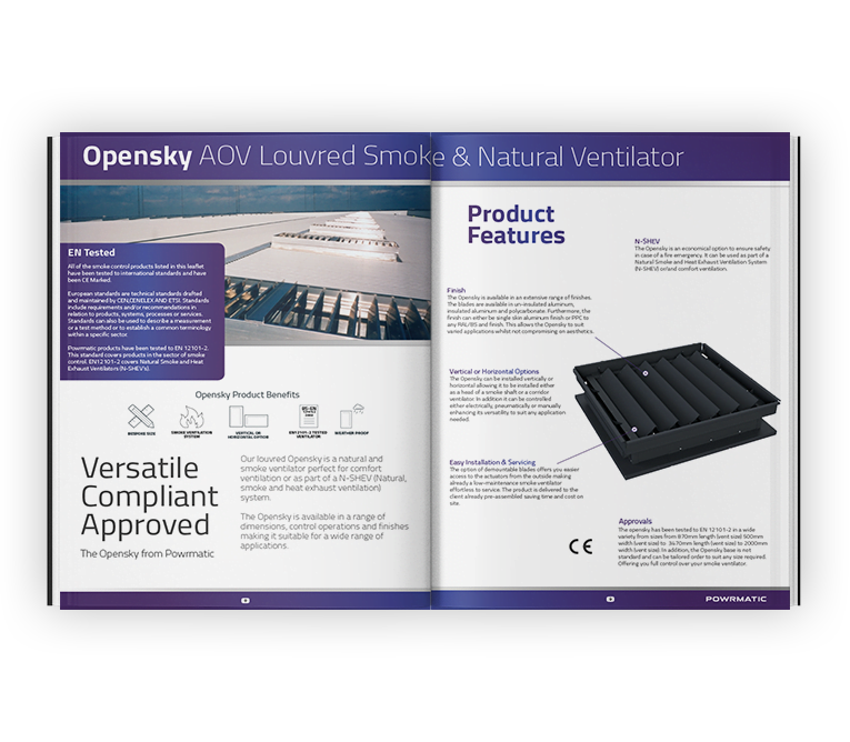 The Stirling can be manufactured in various single or double sizes designed and developed to meet the needs for 1.0m² and 1.5m² Free Area automatic opening vents (AOV’s) for staircase and smoke shaft ventilation applications together with small module units for sealed Lift shaft smoke ventilation systems.